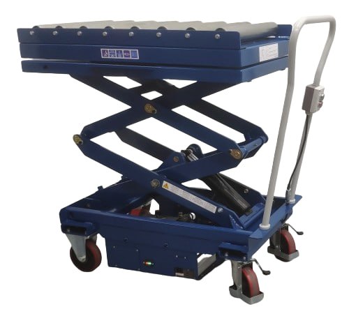 Mesa elevadora ref. 10144 con rodillos que permite trabajar a una altura cómoda para realizar tareas como manipulación, traslación, reparación, embalaje, control de piezas o productos, transporte de piezas en líneas de fabricación, etc.